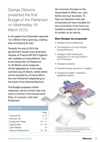 The document summarizes the key tax proposals from the UK's 2015 Budget, including: