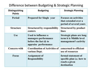 The document discusses budgeting and budgetary control. It defines a budget as a financial plan for a defined period. Budgets estimate profit potential, are stated in monetary terms, generally cover one year, and require management approval. The key aspects of budgets are setting objectives, understanding cost behavior, coordination, communication, flexibility, and accounting data support. Budgets are used for planning, coordination, responsibility assignment, performance evaluation, and adapting to changing conditions. Budgetary control involves establishing budgets, tracking actual performance, analyzing variances, and taking corrective actions.