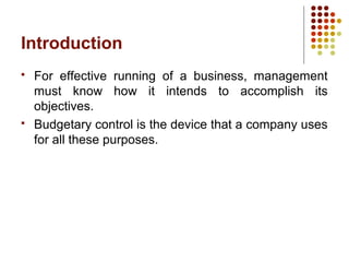 Budgetary control involves companies establishing budgets for revenue, expenses, assets and liabilities in advance of an accounting period. Managers prepare functional budgets for their departments, which are then combined into a master budget. Actual performance is continuously compared to budgets to ensure plans are achieved or provide a basis for revision. Budgetary control coordinates activities, provides responsibility accounting, motivates managers, and establishes a system for planning and control through regular budget reviews.