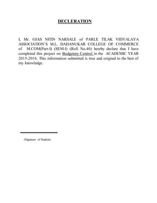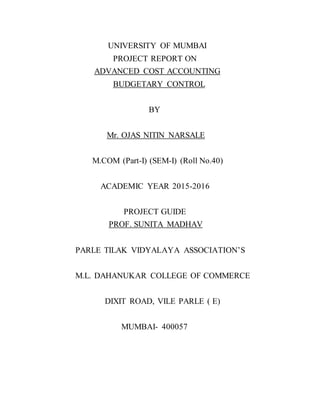 This document is a project report submitted by a student named Ojas Nitin Narsale to the University of Mumbai for an Advanced Cost Accounting and Budgetary Control course. The report discusses various types of budgets including zero-base budgeting, performance-based budgeting, and flexible budgets. It provides definitions and comparisons of different budgeting models and their advantages and disadvantages. The report also discusses key aspects of zero-base budgeting and its use in both the public and private sectors.