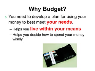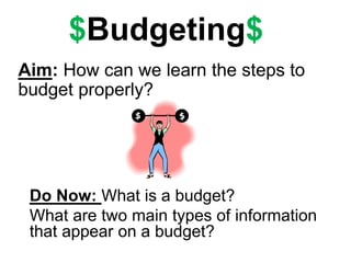 The document provides steps for proper budgeting. It begins by defining a budget and the key types of information included - needs versus wants. It then discusses the importance of budgeting to live within your means. The main steps outlined are to set financial goals, estimate income, budget for unexpected and fixed expenses, budget variable expenses, and record spending. Tips are provided such as decreasing impulse purchases, carrying less cash, and shopping smart with coupons.