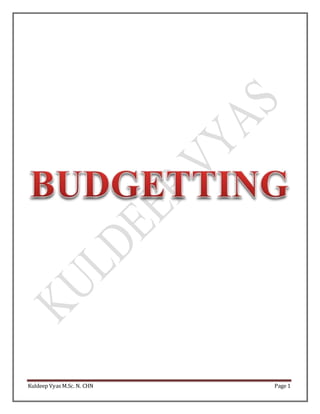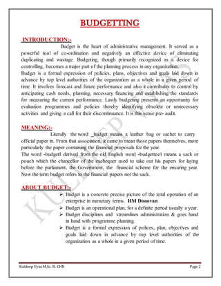 The document discusses the principles, processes, and importance of budgeting in administrative management, emphasizing its role in planning, coordination, and control within organizations. It covers key aspects such as budgeting definitions, purposes, classifications, and procedures, as well as the involvement of staff in budgeting and potential limitations of budgetary control. The document also highlights the responsibilities of various stakeholders, including nurse administrators, in the budgeting process.