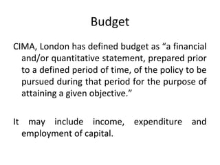 Budgets are financial plans prepared in advance to help achieve objectives. There are various types including sales, production, cash budgets. Budgetary control involves establishing budgets, comparing actuals to budgets, analyzing variances, and revising budgets. The key purposes of budgeting and budgetary control are planning, coordination, communication, motivation, control, and performance evaluation. It helps management anticipate the future, coordinate departments, pinpoint inefficiencies, and direct resources for maximum profit.