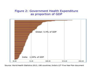 Changing pattern ofpublic health expenditure • India needs to double or triple its existing health spending with their proper allocations Decentralization Community participation. • Financing control more important at the primary level. • Budgeting important tool in financial planning in health care