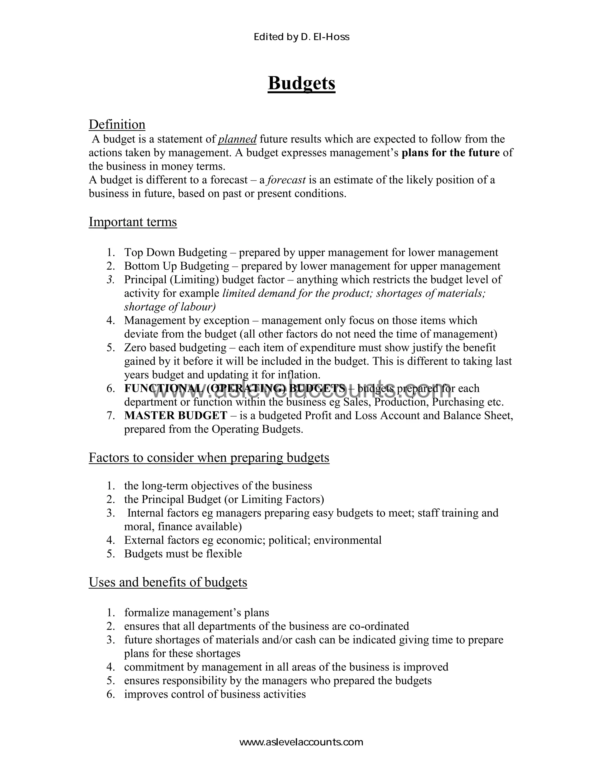 A budget is a statement of planned future results expected from management's actions, expressed in monetary terms. It differs from a forecast, which estimates likely future positions based on past or present conditions. Budgets are prepared top-down by upper management or bottom-up by lower management. Functional budgets are set for each department based on principal budget factors like demand or materials. Operating budgets must match each other with sales budget set first, then production, purchasing, and expenditures. A master budget combines the functional budgets into a projected profit and loss statement and balance sheet. Budgets formalize plans, coordinate departments, indicate shortages, improve management commitment and control.