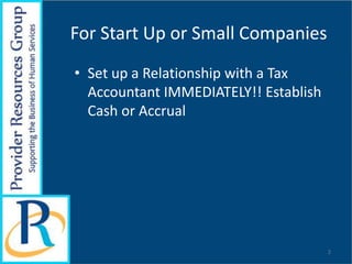 The document outlines best practices for budgeting and financial tracking for startups and small companies, emphasizing the importance of establishing a relationship with a tax accountant and using accounting software like QuickBooks or Peachtree. It advocates for keeping financial reports simple and timely to assist managers in decision-making, and highlights the need for key reports, such as monthly financial summaries and biweekly productivity data. Ultimately, the document stresses that effective financial management is vital for the success of any company, particularly in low-margin industries.
