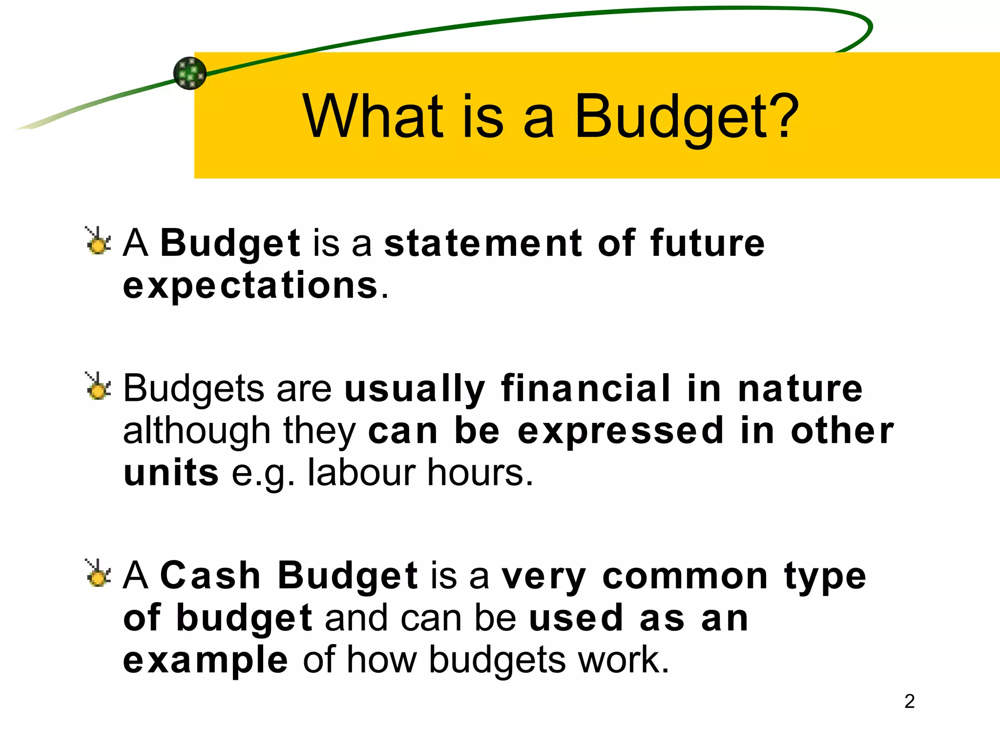 A budget is a forecast of future financial expectations. A cash budget specifically forecasts a company's future cash position. It is produced for internal use, while a cash flow statement looks at past financial events for external use. Budgets are used for monitoring performance, setting targets, delegating responsibility, and gaining information. They allow management to plan, organize resources, make informed decisions, coordinate departments, control performance, and motivate employees.