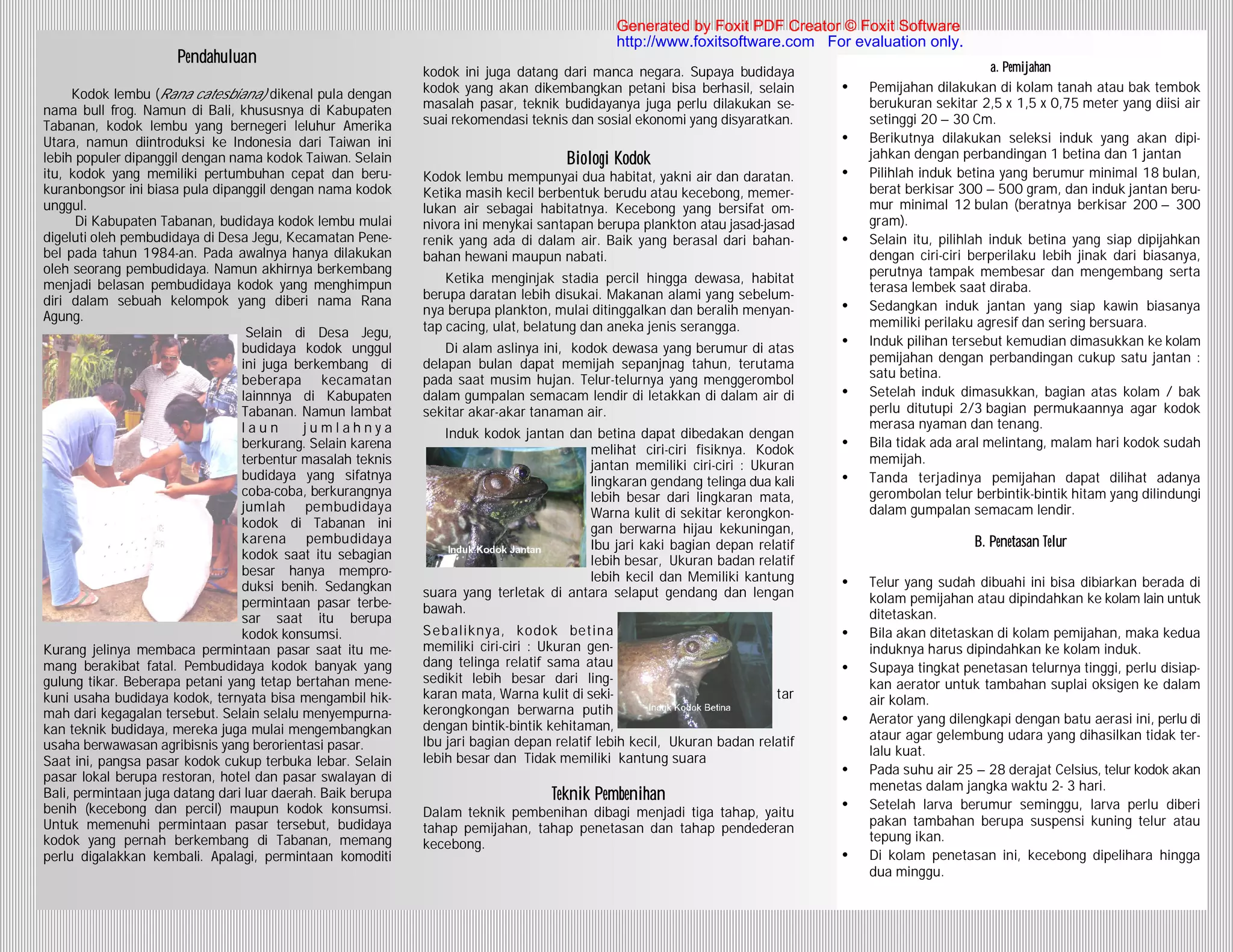 Kodok lembu (rana catesbiana) atau kodok taiwan telah berkembang di Bali, khususnya di Kabupaten Tabanan sejak tahun 1984, meskipun jumlah pembudidayanya menurun akibat kurangnya pemahaman tentang permintaan pasar. Saat ini, permintaan akan kodok konsumsi dan benih terus meningkat, baik dari pasar lokal maupun luar daerah. Oleh karena itu, penting untuk meningkatkan teknik budidaya dan memenuhi syarat teknis serta sosial ekonomi untuk keberhasilan usaha ini.