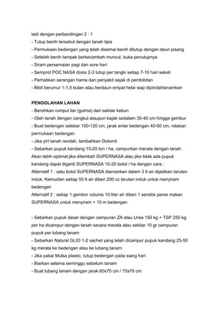 Dokumen ini membahas teknik budidaya terong untuk meningkatkan produksi dalam skala agribisnis dengan syarat tumbuh yang tepat dan langkah-langkah dari pembibitan hingga panen. Ditekankan pentingnya pengendalian hama dan penyakit serta pemupukan yang sesuai untuk mencapai hasil optimal. Metode pemangkasan, penyulaman, dan penggunaan pupuk organik juga diuraikan untuk memperbaiki kualitas tanaman.