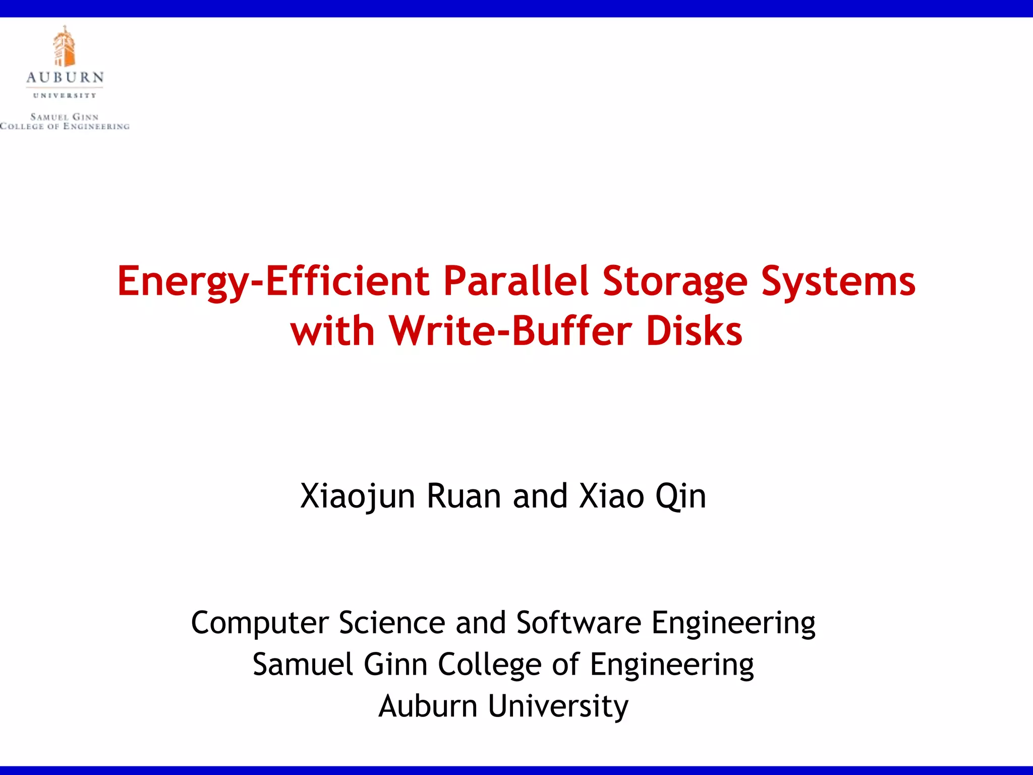 The document presents research on energy-efficient parallel storage systems utilizing write-buffer disks, aimed at reducing power consumption in data centers. It discusses the architectural design and simulation of a buffer disk system to optimize energy efficiency while managing performance. The findings illustrate the impact of workload on energy consumption and suggest strategies to maintain disks in standby mode to minimize energy usage.