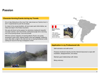 Travelling helped the author develop personally and professionally in several ways. A 4-day hike on the Inca Trail to Machu Picchu required pushing physical limits and fostered teamwork. Climbing mountains in hot and cold climates required suffering but achieving goals through determination. Experiences like navigating rivers in Bolivia and organizing family trips taught strategic thinking around decision making, responsibility, planning, and compromise. Overall, extensive global travel built character traits like self-motivation, problem solving, relationship building, and vision that contribute to leadership in the professional world.