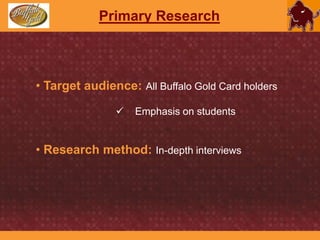 The document outlines a public relations campaign to increase usage of the Buffalo Gold Card by 30% by the end of May 2011 through tactics like contests, savings and rewards programs, direct deposit options, social media giveaways and promotions, text message deals, and continued advertising. Primary research found that students wanted easier depositing, more spending areas, and special offers. The strategies aim to demonstrate the card's value and create interest through new opportunities.