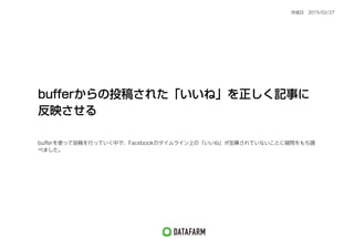 bufferからの投稿に「いいね」を正しく記事に反映 させる bufferを使って投稿を行っていく中で、Facebookのタイムライン上の「いいね」が加算されていないことに疑問をもち、 調べました。 作成日 2015/02/27