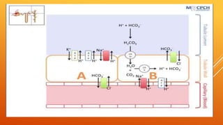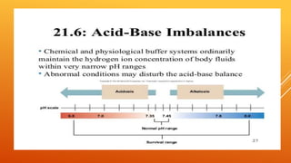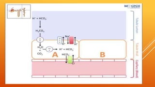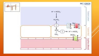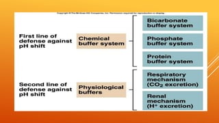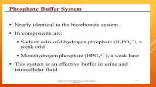 2) The phosphate buffer system is the major buffer in urine and uses hydrogen phosphate and monohydrogen phosphate ions. It has less total buffering power than the bicarbonate system but works to buffer the kidney filtrate and excrete excess acid or base without altering urinary pH.