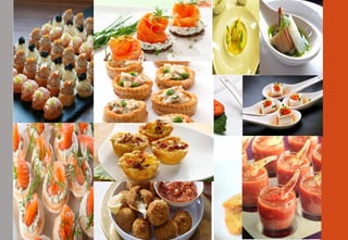 The document discusses planning and presenting buffets. It addresses menu development, considering themes, guest expectations and profitability. Safety, sanitation and maintaining proper food temperatures are priorities. Buffets can be laid out in single or double-sided styles, and action stations allow interaction. Hors d'oeuvres should be neatly presented and portioned to be appealing from start to finish.