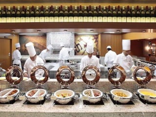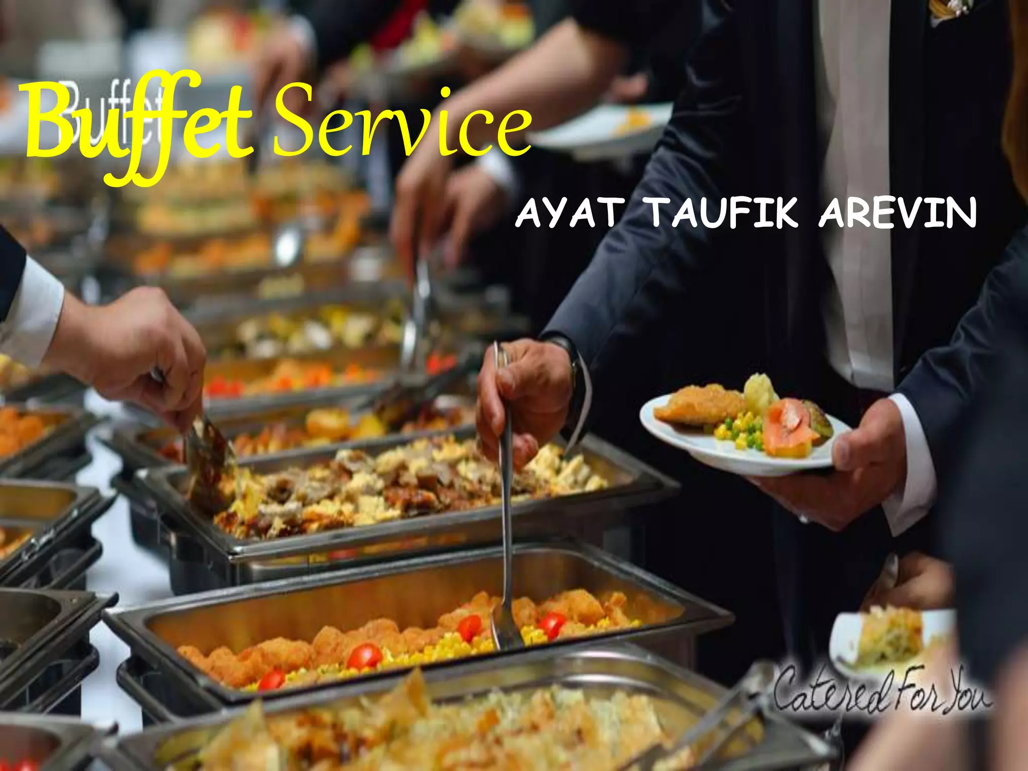 Dokumen tersebut membahas tentang pengertian dan bentuk pelayanan buffet, perbedaan antara sitting dan standing buffet, fungsi meja buffet dan perencanaan pengaturan meja buffet, termasuk faktor-faktor yang perlu diperhatikan seperti tema acara, jumlah tamu, pilihan menu, waktu pelaksanaan, dan fasilitas yang tersedia.
