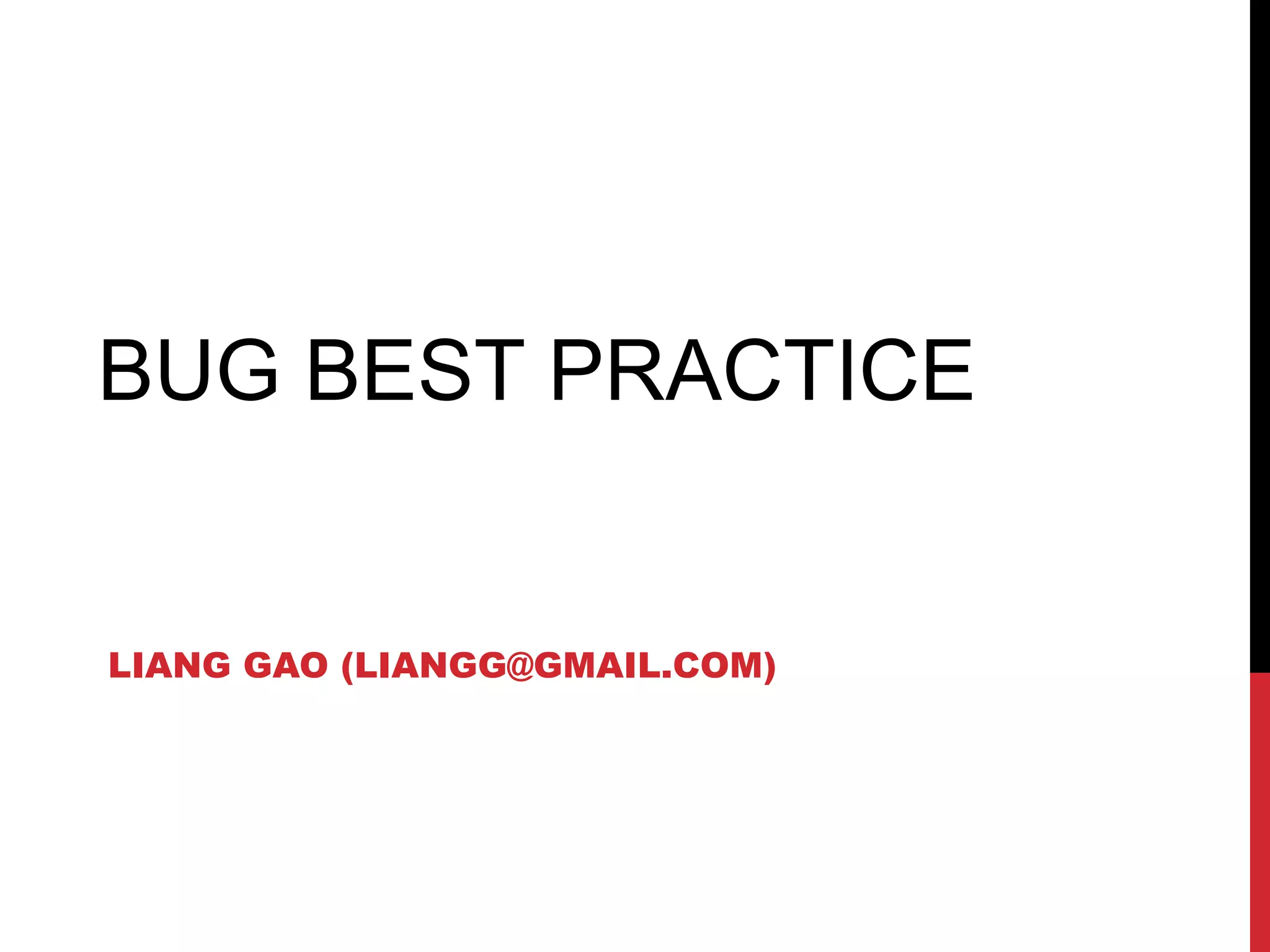 The document provides guidance on best practices for bug filing and management. It discusses how to write high-quality bug reports that are reproducible by developers. It emphasizes the importance of thoroughly documenting steps to reproduce issues and providing all relevant information. The document also covers defect tracking metrics and how they can be used to assess testing progress and product quality.