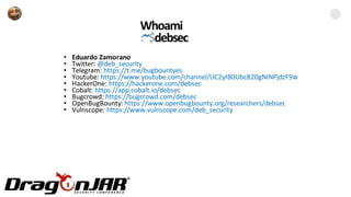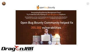 The document discusses bug bounty programs, highlighting platforms like HackerOne and Bugcrowd, which reward individuals for reporting software vulnerabilities. It lists various types of errors, including XSS and command injection, and emphasizes the importance of perseverance in bug hunting. The content also shares examples of exploit payloads and bug-related experiences from meetups.