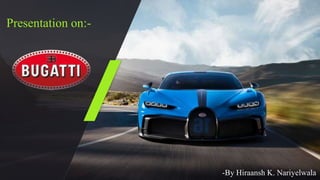 The document provides information about Bugatti, a luxury automotive brand founded in 1909 in Molsheim, France by Italian-born Ettore Bugatti. It discusses Bugatti's history and evolution over more than 100 years, including details about its founder, early production facilities, logo design, and key models like the Veyron and Chiron. It also shares specifications, fun facts, and conclusions about Bugatti's striving for perfection and pushing boundaries in automotive engineering.