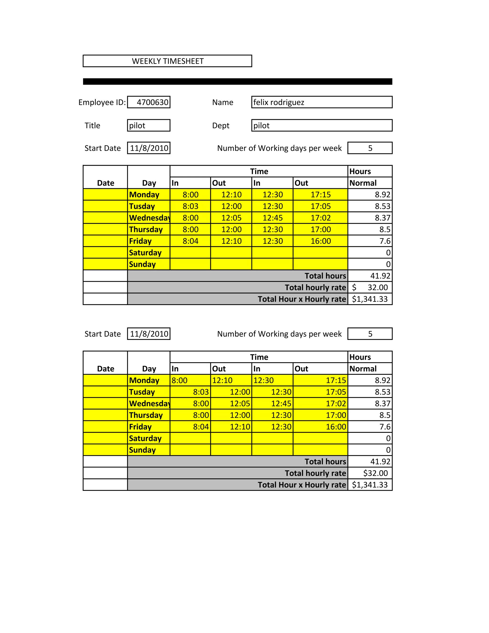 The weekly timesheet summarizes Felix Rodriguez's work hours for the week of November 8-15 as a pilot. It shows he worked 41.92 hours over 5 days at an hourly rate of $32, for a total of $1,341.33 in wages. The second document is Felix's budget for November, showing $2,649 in expenses but no income listed for the month, resulting in a projected monthly balance of -$2,649.