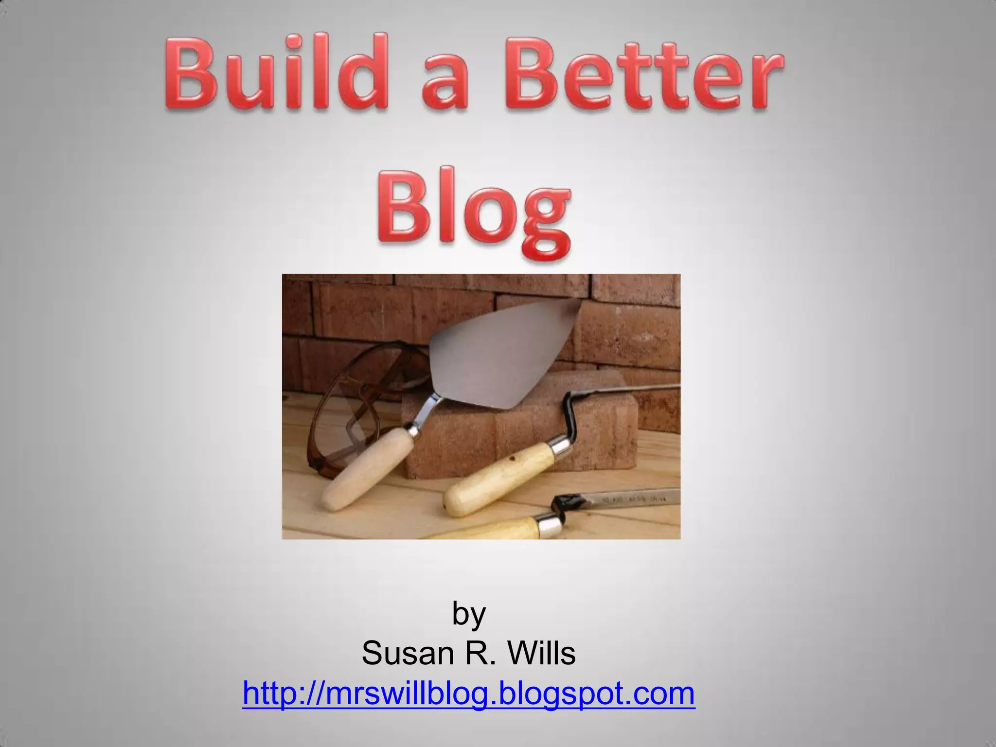 The document provides step-by-step instructions for creating and customizing a blog using Blogger. It explains how to sign up for an account, set up a blog title and address, make posts, add images, videos, slideshows and other features. Tips are included for using a blog to advertise a library, showcase student work, and provide information to parents and students.