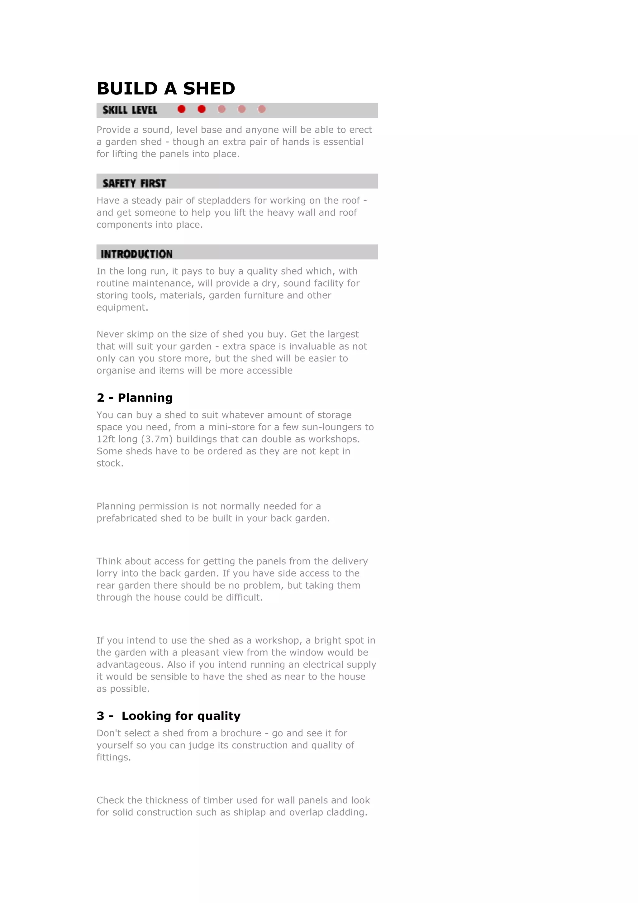 The document provides instructions for building a garden shed. It discusses selecting a site with a level base, choosing a shed size and style, erecting the walls and roof, adding insulation and power, and maintaining the shed. The key steps are to lay a level concrete base, construct the walls by screwing together prefabricated panels, attach the roof panels, and finish with felt roofing and other protective finishes. An extra set of hands is recommended to help lift heavy components into place during construction.
