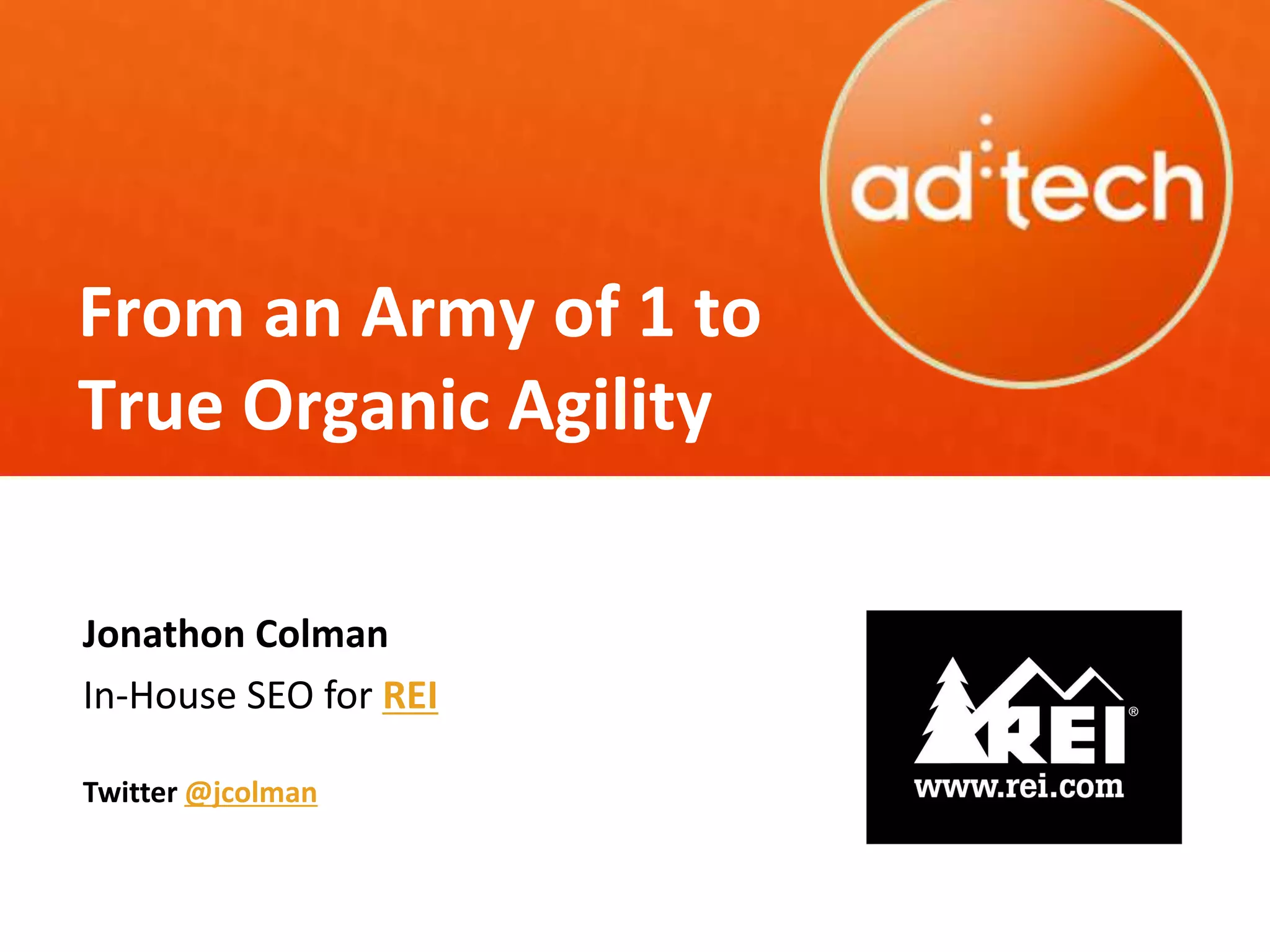 Jonathon Colman discusses the transition from individual-focused SEO efforts to an agile, team-based approach in search marketing, highlighting the limitations of a single-person strategy such as scalability issues and burnout. He recommends building cross-functional teams that prioritize customer experience and iterative improvements, which has led to significant increases in organic traffic and reductions in duplicate content for REI. Colman concludes with resources for further exploration of agile marketing principles and practices.