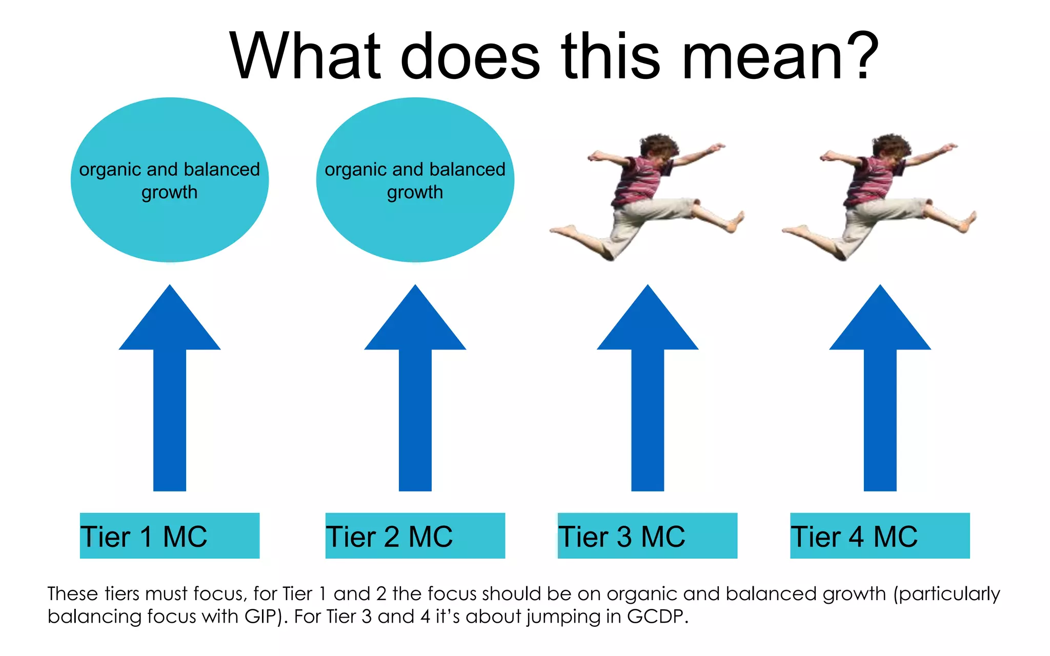 For Tier 1 and 2 LCs, the focus should be on organic and balanced growth, balancing program growth with general internal development. For Tier 3 and 4 LCs, the focus shifts to jumping into iGCDP by scaling up program delivery.