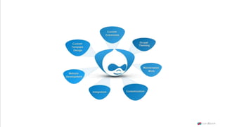 The document outlines a Drupal project built using Drush, detailing various command line functionalities and version compatibilities for different Drupal and Drush versions. It also highlights CI&T's global presence and expertise in Drupal development, mentioning their partnerships and locations. Additionally, it includes specifics on project configurations and patches related to Drupal and third-party libraries.