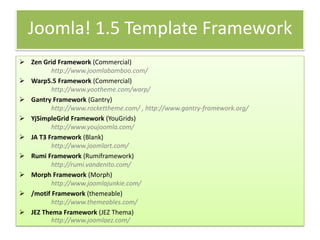 This document discusses the JA T3 Framework 2.0, a template framework for building Joomla templates. It highlights the framework's main features like improved multiple layouts, mobile readiness, and cache/compression. The template administration panel is also introduced, which allows configuring profiles, layouts, themes, and other template settings. Screenshots demonstrate template previews and the framework's capabilities like support for RTL languages and different menu types.
