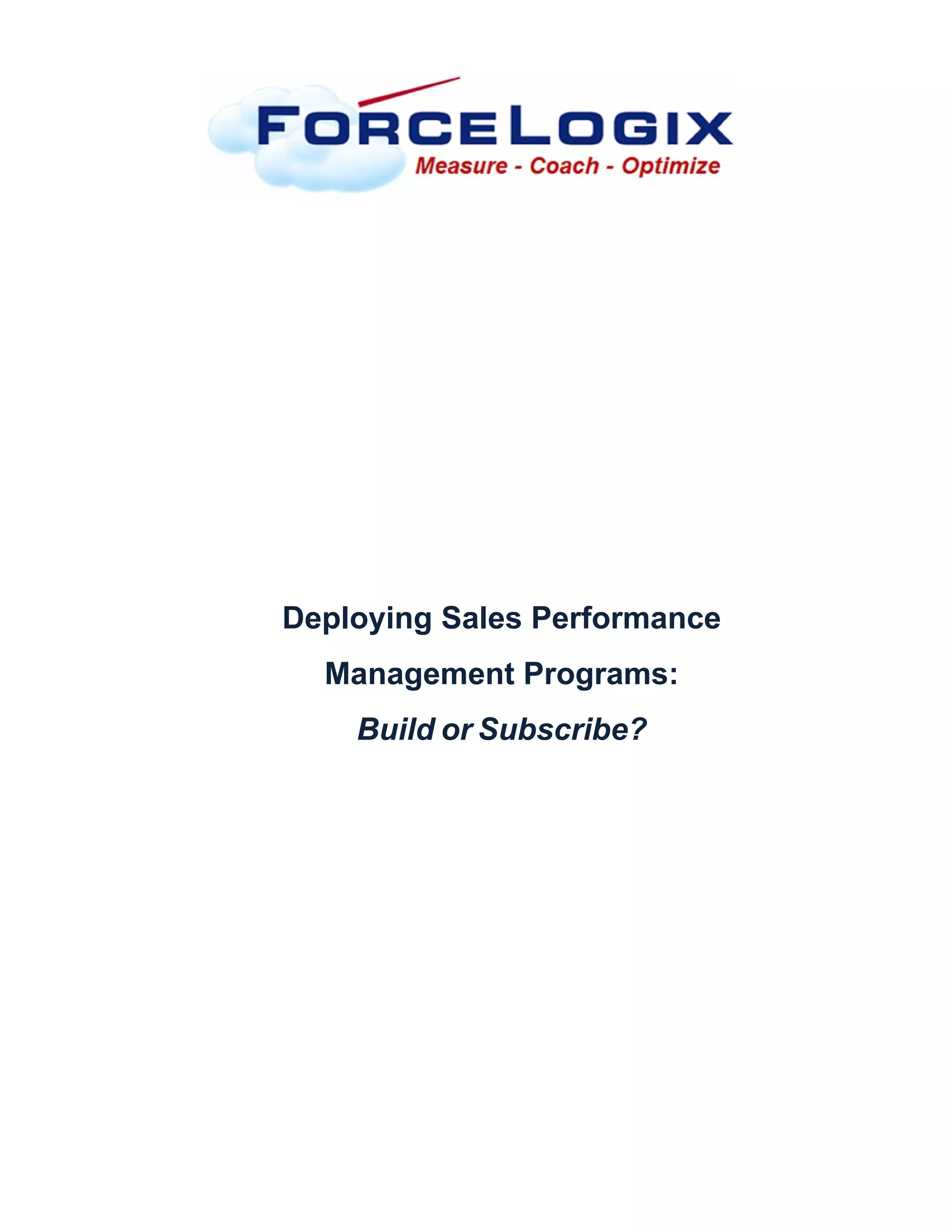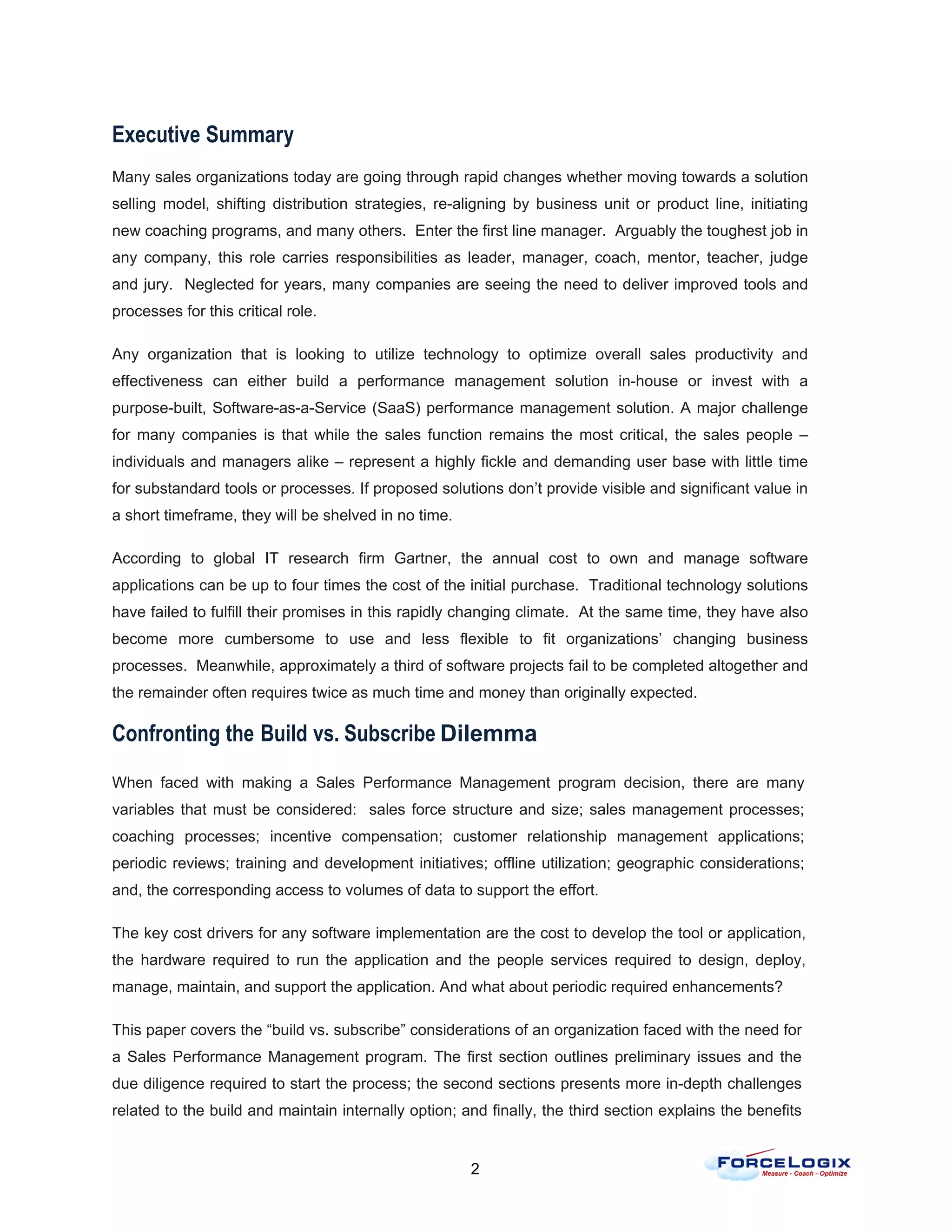 The document discusses the considerations around whether to build a sales performance management system in-house or subscribe to a software-as-a-service (SaaS) solution. Building a custom system can be very expensive due to development and maintenance costs and may not provide improvements over time. Subscribing to a SaaS solution offers lower costs, faster implementation, flexibility, integrated processes, and reliability due to expertise from purpose-built vendors. The document analyzes factors around resources, complexity, timelines, and costs to evaluate the best approach.