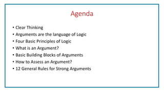 The document outlines essential principles and rules for constructing strong arguments in academic writing, emphasizing logical thinking and reasoning. It covers various types of arguments, how to assess their strength, and common sources and forms of illogical thinking. The document also presents guidelines for delivering effective oral and written arguments, as well as highlighting the importance of seeking credible sources.