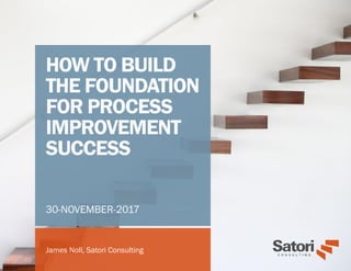 The document outlines a structured approach to process improvement led by James Noll from Satori Consulting, emphasizing the importance of analyzing current processes and designing target states. Key tools and methodologies discussed include business process decomp (BPD), process maps, and scan worksheets aimed at improving efficiency, reducing costs, and aligning with organizational objectives. The document stresses that process improvement is a non-linear, continuous journey requiring the involvement of all stakeholders and regular updates to ensure adaptability and ongoing effectiveness.