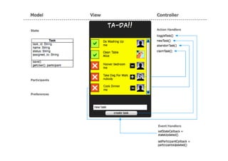 The document outlines the steps to create, upload, and manage collaborative widgets using HTML, XML, and JavaScript. It covers widget anatomy, including necessary files such as config.xml and index.html, as well as methods for managing state and participants. Additionally, it provides example code snippets and guidance on creating functions for task management within the widget environment.