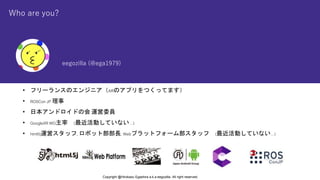 (@ega1979) Copyright @Hirokazu Egashira a.k.a eegozilla. All right reserved. • フリーランスのエンジニア(ARのアプリをつくってます) • ROSCon JP 理事 • 日本アンドロイドの会 運営委員 • GoogleXR WG主宰 (最近活動していない…) • html5j運営スタッフ, ロボット部部長, Webプラットフォーム部スタッフ (最近活動していない…)