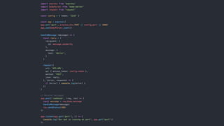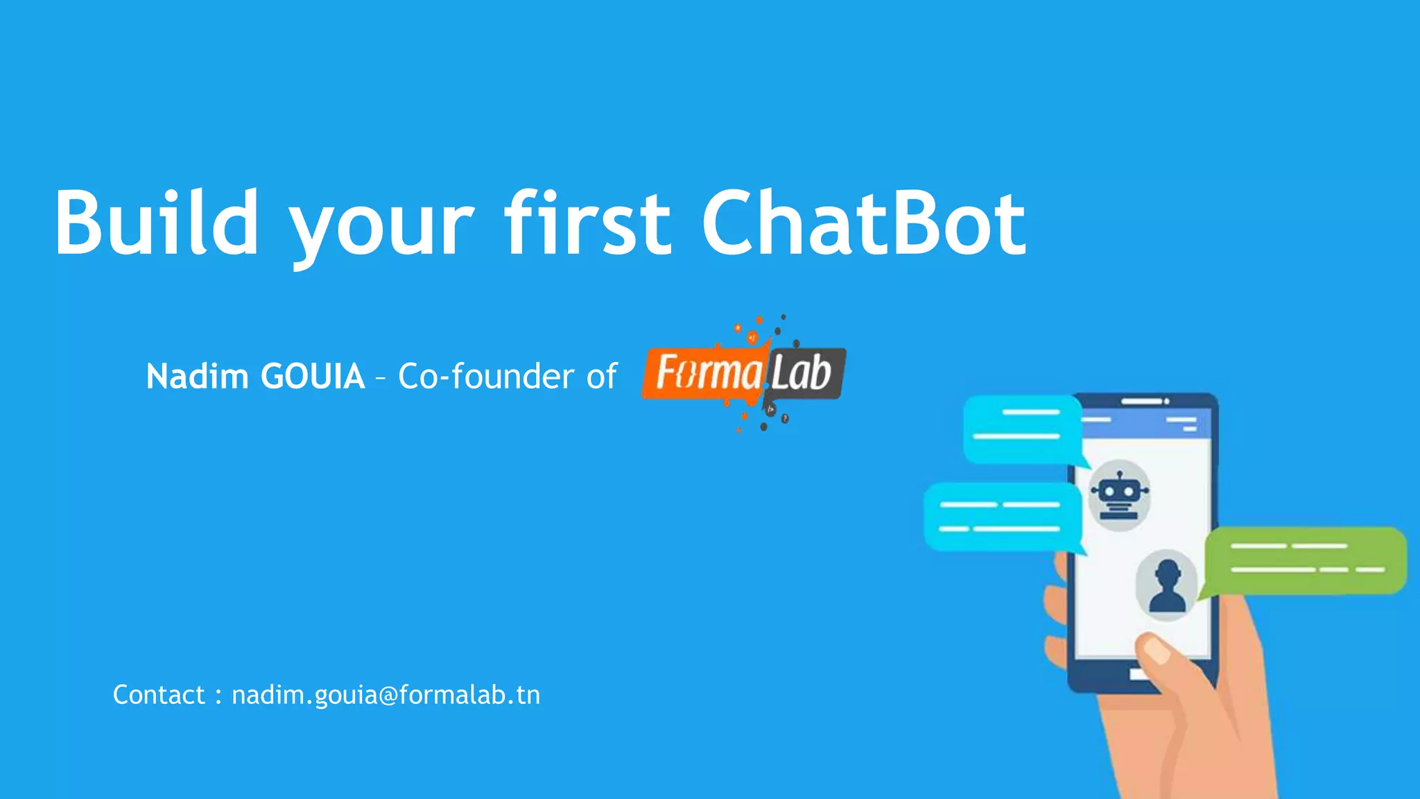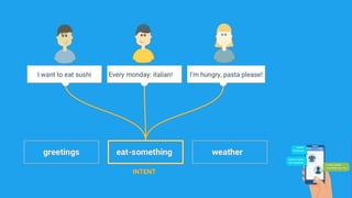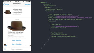 This document provides steps to build a basic chatbot that can connect to Facebook Messenger. It outlines setting up a development environment with Express.js and ngrok, integrating with Dialogflow for natural language processing, and connecting to Facebook through a developer application to handle messages. The example builds a simple "parrot" chatbot that repeats user messages back to demonstrate the process.