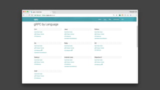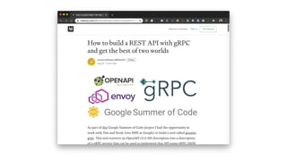 This document discusses building REST APIs using gRPC, emphasizing its modern, high-performance RPC framework that supports various environments and languages. It outlines the specification-first approach for calling and building gRPC services and highlights the advantages of implementing APIs with gRPC, including scalability and extensibility. The document also mentions the integration of OpenAPI services with gRPC and tools for transcoding between gRPC and REST APIs.