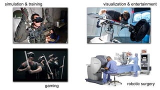 This document provides an introduction to building virtual reality display systems for hobbyists and educators. It discusses the history and applications of VR, key engineering challenges in the field, and gives an overview of the Stanford EE 267 course where students build their own VR head-mounted displays. The document covers topics such as the graphics pipeline, sensor fusion for tracking, and spatial sound. It also profiles the open-source VRduino hardware platform used in the course for orientation tracking, input interfacing, and more. Overall, the document serves as a guide for those interested in developing VR technology through a do-it-yourself approach.
