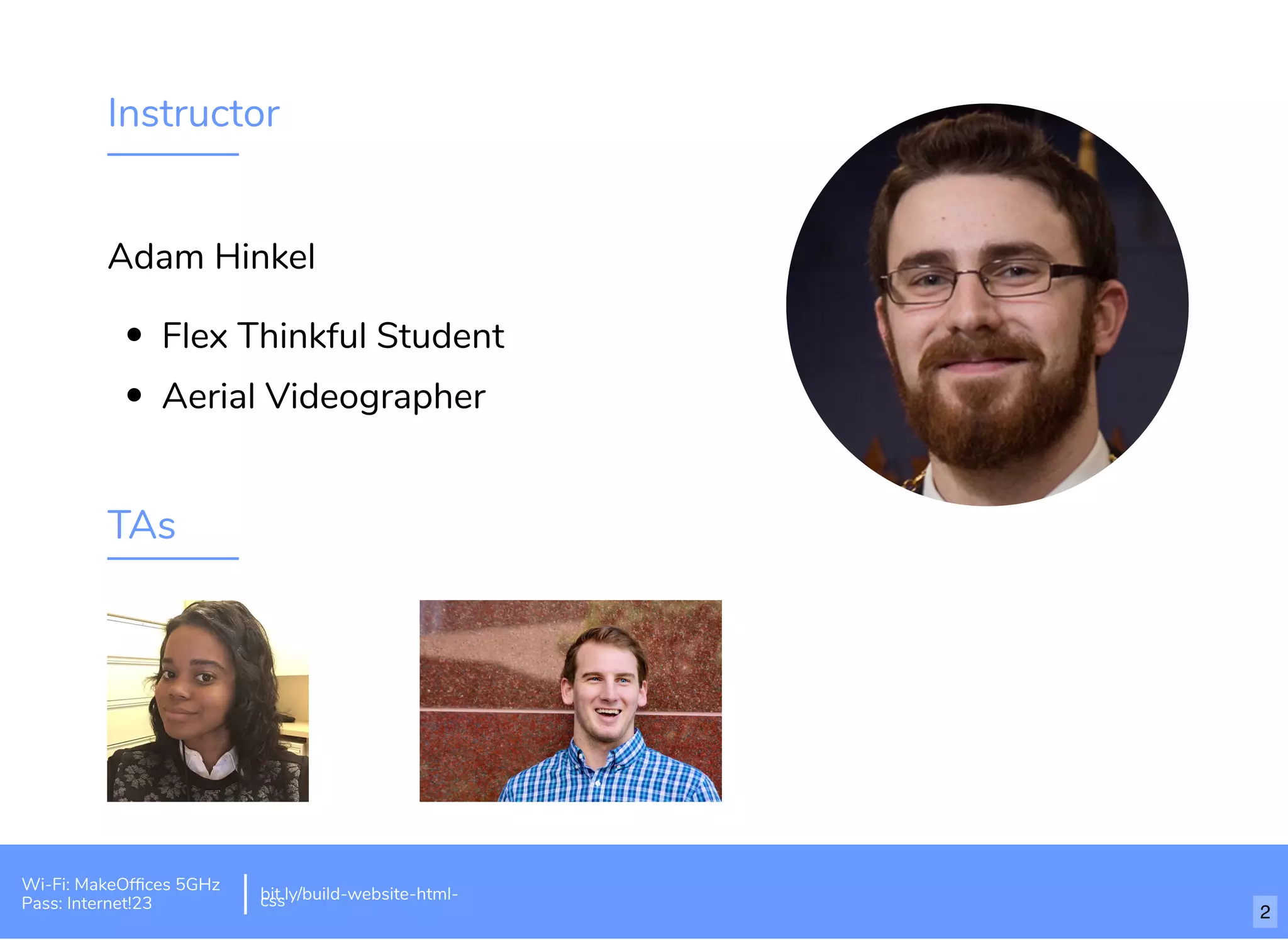 This document outlines an agenda for a workshop to teach participants how to build their own website. The workshop will be led by Adam Hinkel and will include an introduction to HTML and CSS concepts, a review of starter code, a building period with support from TAs, and suggestions for continuing education. Participants will learn key elements of HTML like tags and attributes, and CSS concepts like selectors, properties, and values to style and lay out pages. The goal is to have participants leave with the skills and resources to continue developing websites on their own.