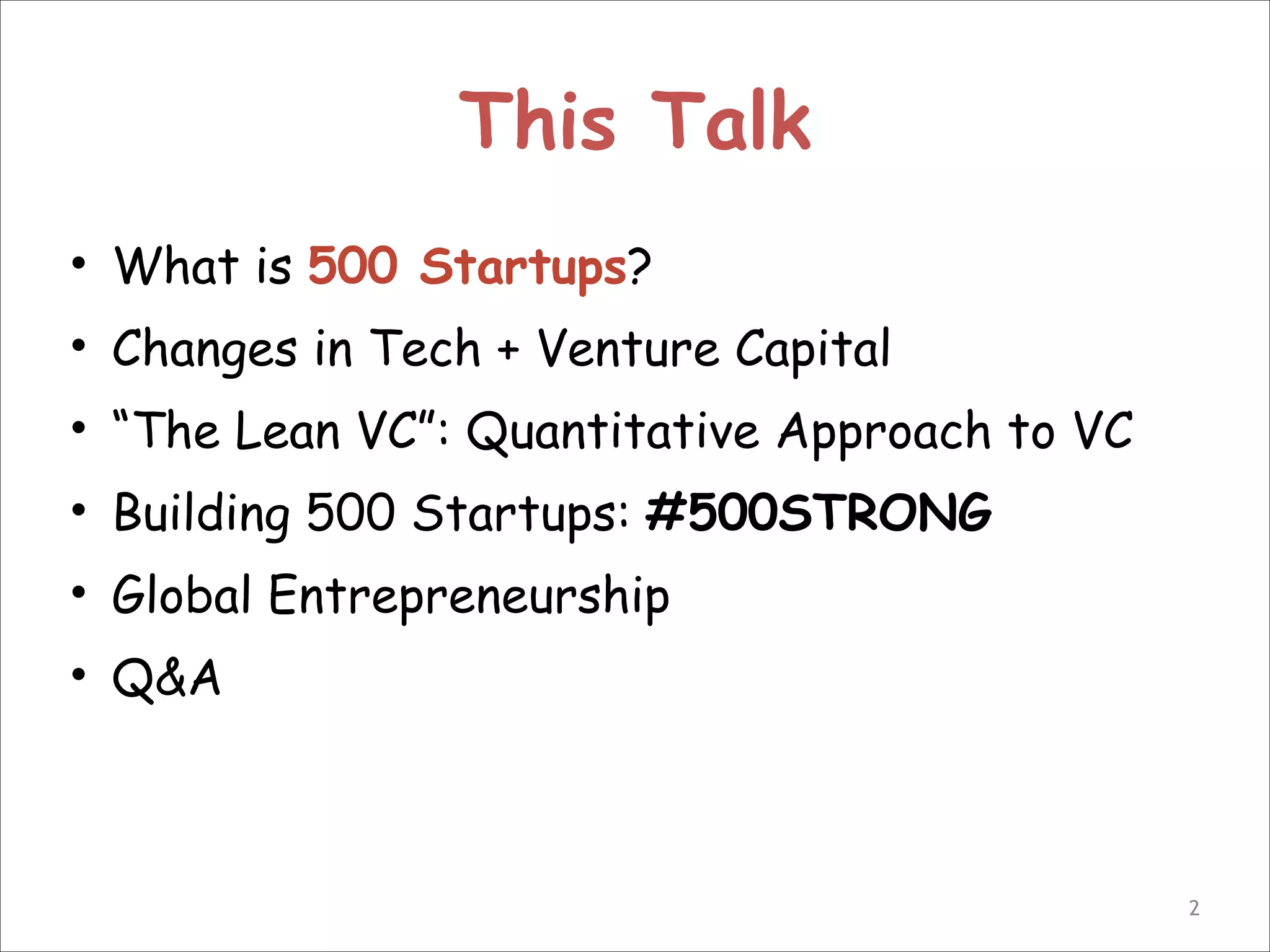 This document provides an overview of a talk given by Dave McClure, the Founding Partner and Chief Troublemaker of 500 Startups. The talk discusses what 500 Startups is, changes in technology and venture capital, the concept of "The Lean VC" which involves making lots of small bets on startups, and building the 500 Startups ecosystem globally. It also outlines 500 Startups' investment stages and approach to deal flow, portfolio development, follow-on strategy, and using feedback loops and metrics.