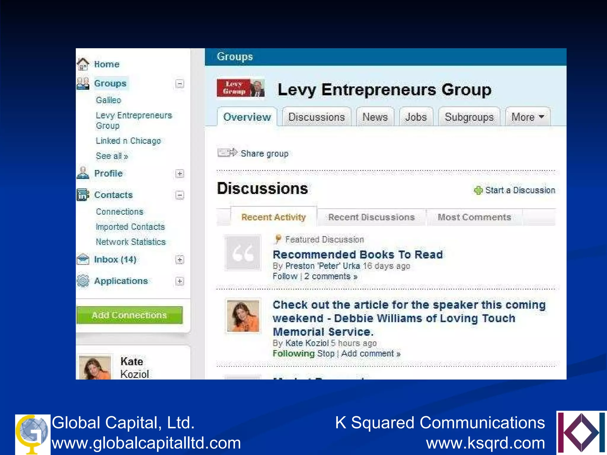 The document provides an overview of starting and building a business through social media. It discusses the reach and growth of major social media platforms like Facebook, LinkedIn, and Twitter. It then offers tips for using these platforms to engage customers, cut marketing budgets, and make sales. The key recommendations are to regularly engage in conversations on social media, build networks and groups, and leverage social media as part of an overall marketing strategy.