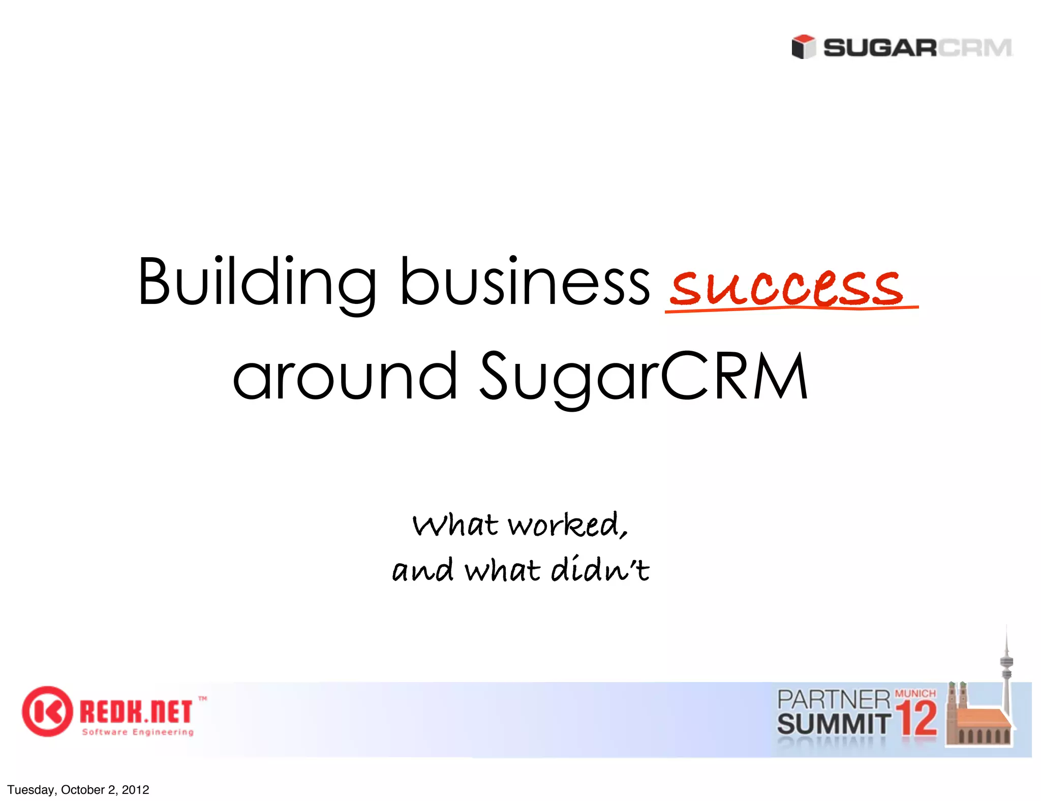 The document discusses what worked in building business success around SugarCRM for a software engineering services company founded in 2006. A structured multi-channel marketing strategy was effective with key metrics in place to measure performance. Nearly 60% of sales came from up-selling existing clients, with 80% of income from 30% of accounts through customer referrals. The focus was on quality lead generation and customer retention through customer segmentation and lifecycle management.