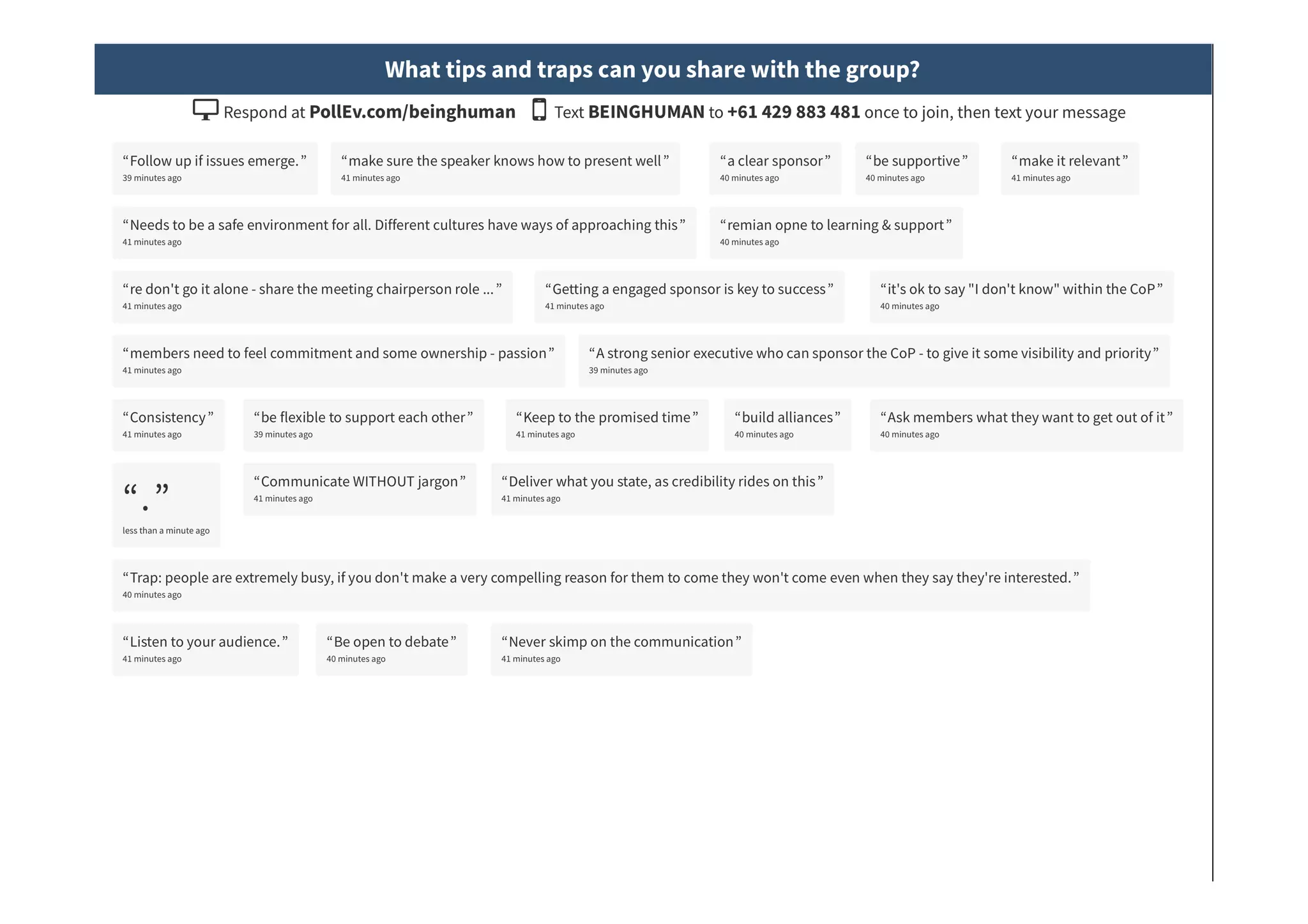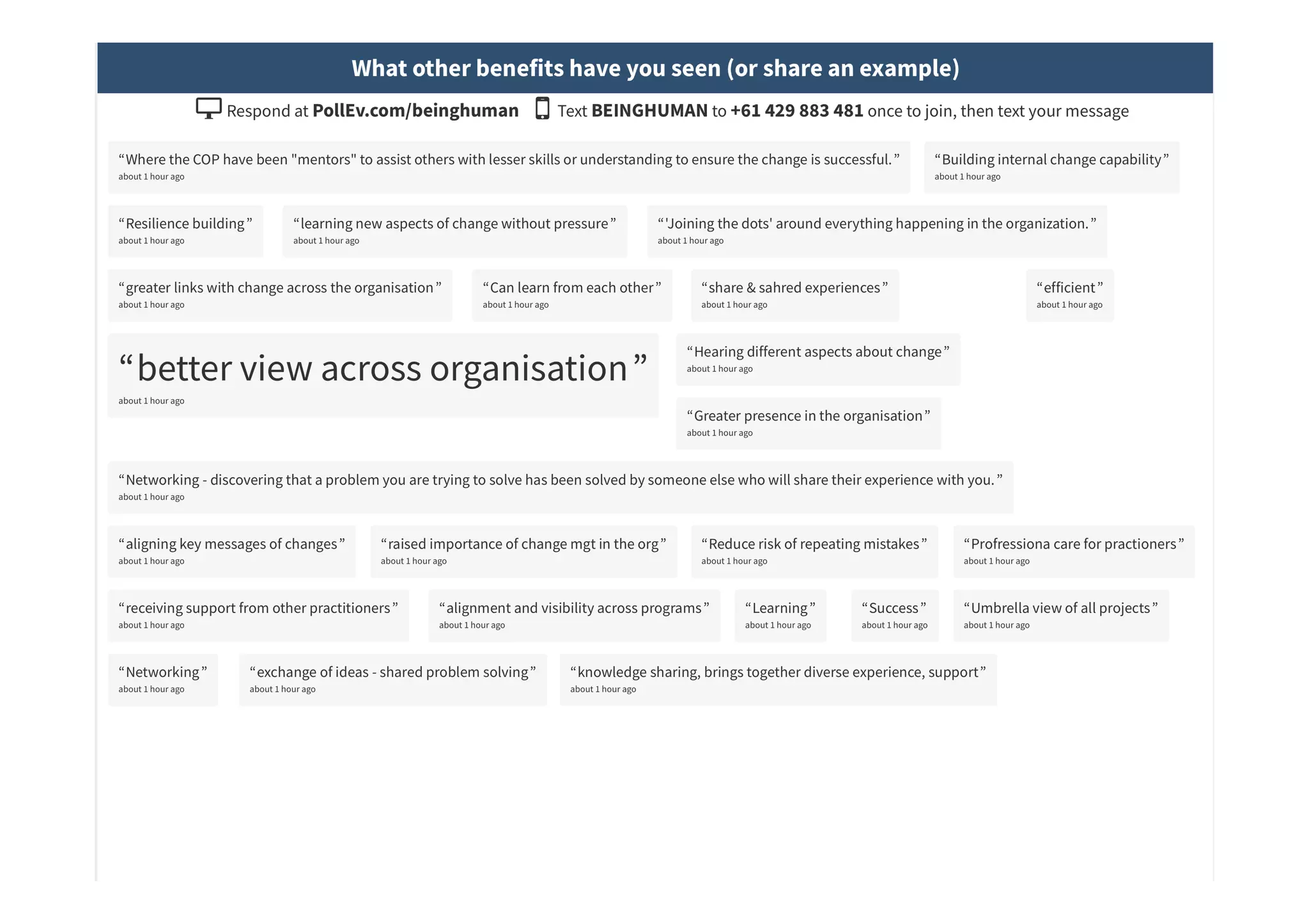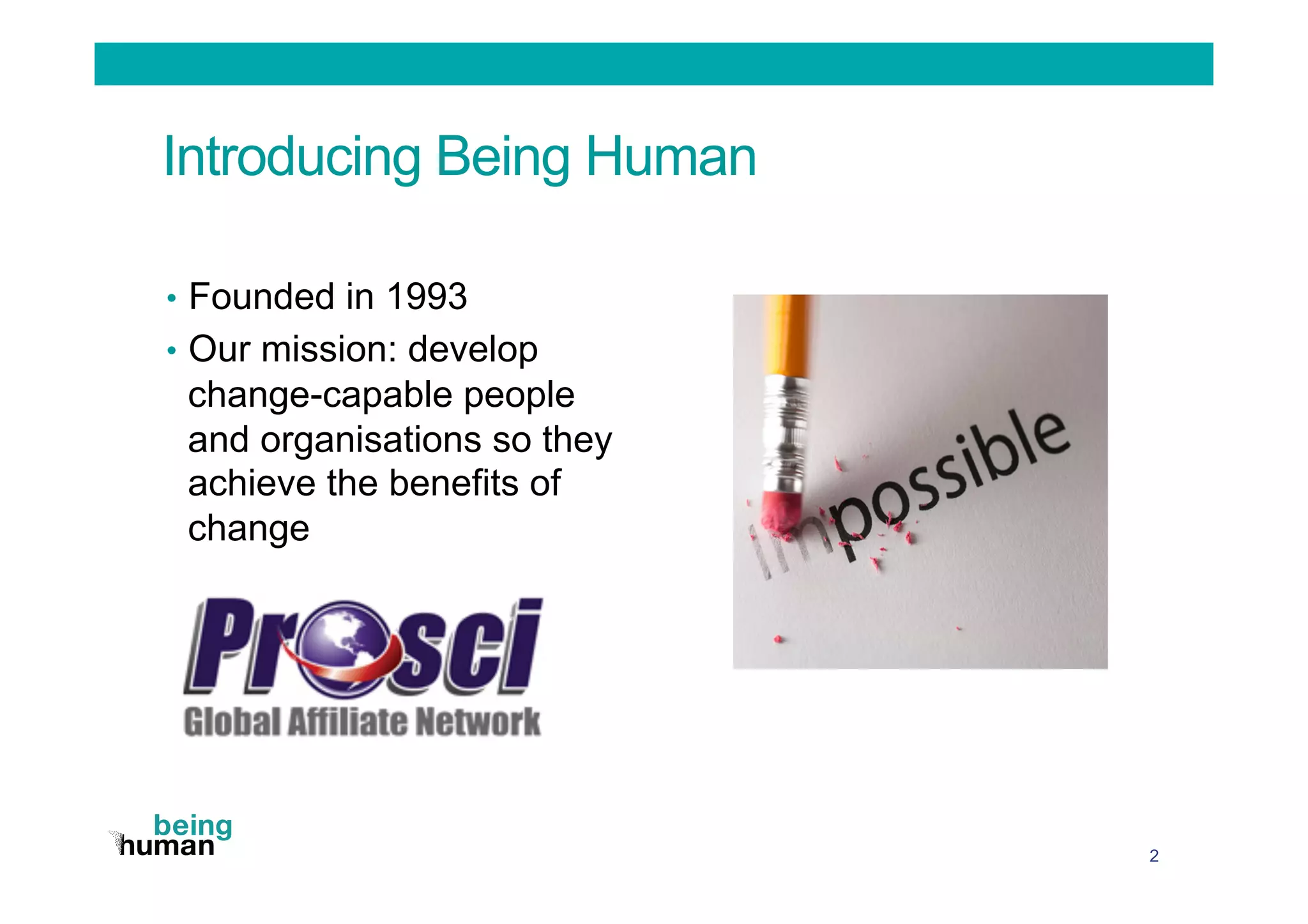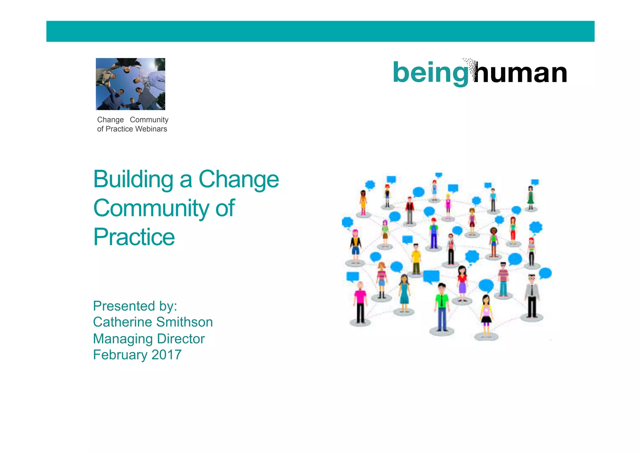 The document outlines the establishment and benefits of a Change Community of Practice (CoP), emphasizing collaboration among change management professionals for knowledge sharing and professional development. It highlights key tips for success, such as securing a sponsor, defining purpose and membership, and engaging members effectively. The CoP aims to enhance change management capabilities and ensure organizations maximize their investment in change initiatives.