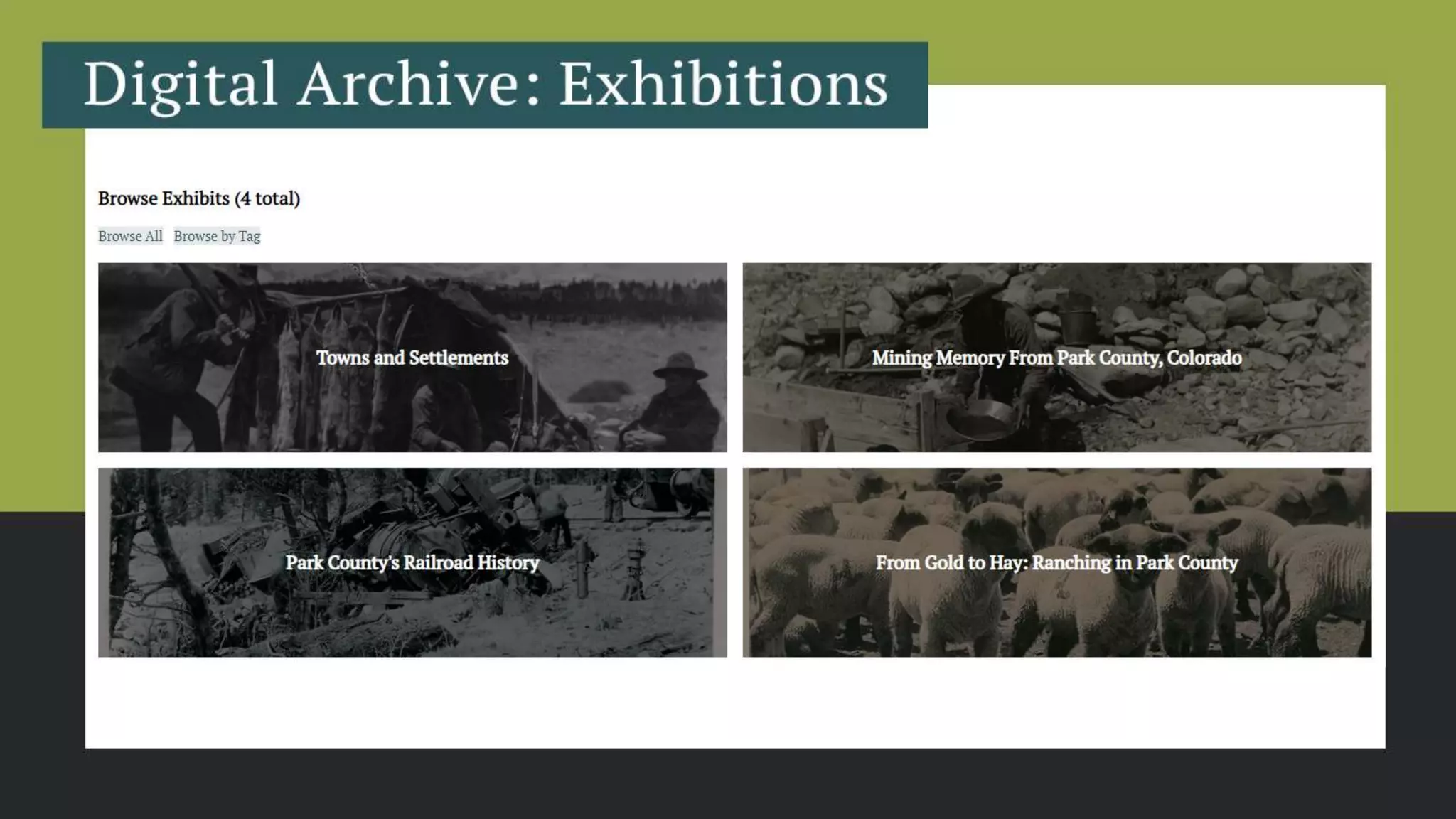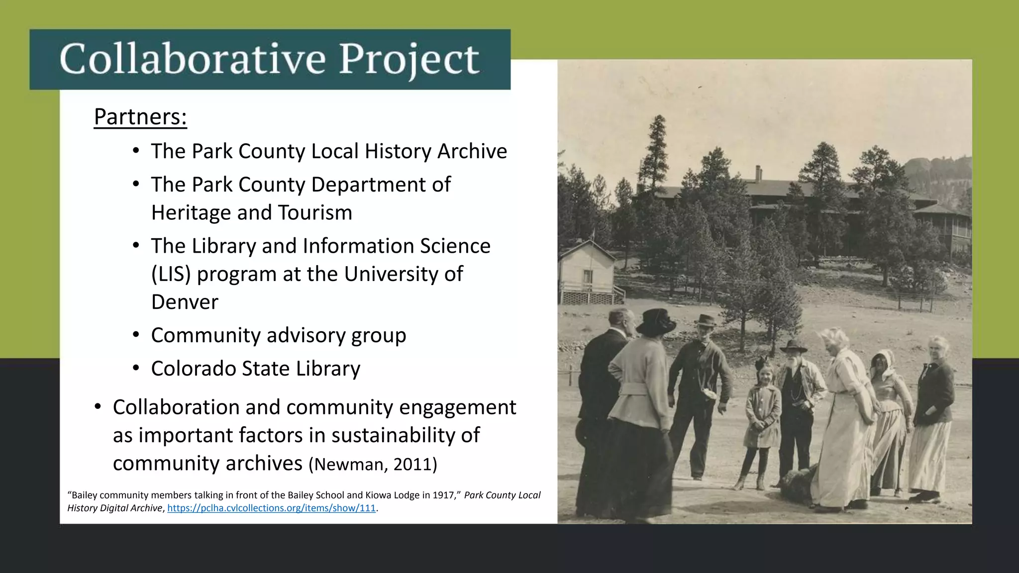 The document summarizes the Park County Local History Archives (PCLHA) project which digitized over 4,000 photographs, 60 oral histories, and other historical materials from Park County, Colorado. The project was a collaboration between community groups, libraries, and universities. Materials were scanned and most original items were returned to families. Select items were re-scanned at higher resolution. Ongoing work includes community outreach and re-scanning additional items. The PCLHA demonstrates the important role community archives play in preserving local history and identity.