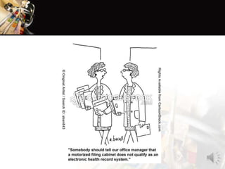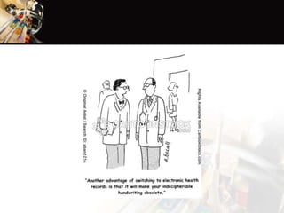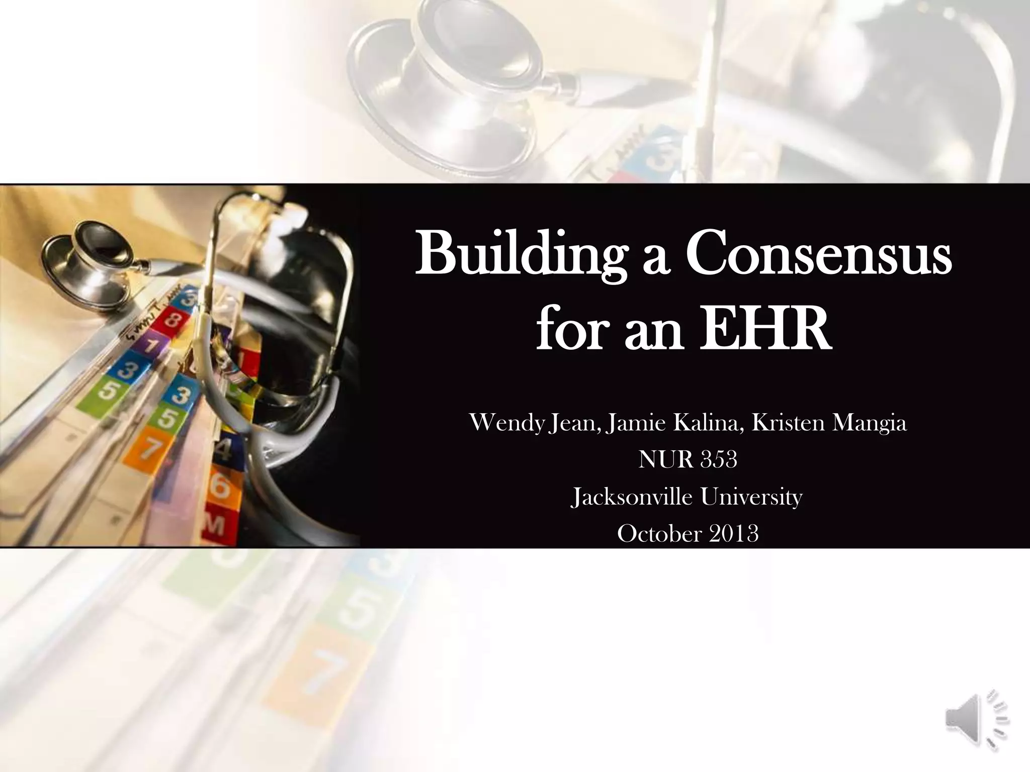 This document discusses building consensus for electronic health records (EHRs) in healthcare. It begins by outlining goals for improving healthcare quality put forth by the Institute of Medicine. It then discusses executive mandates for implementing EHRs and defines EHRs and how they differ from electronic medical records. Factors driving the need for EHRs are described. The stages of EHR implementation and meaningful use requirements are outlined. Attributes of EHRs that support continuity of care are listed. Considerations for EHR implementation including costs, downtime, caregiver assistance, and data integrity are also discussed.