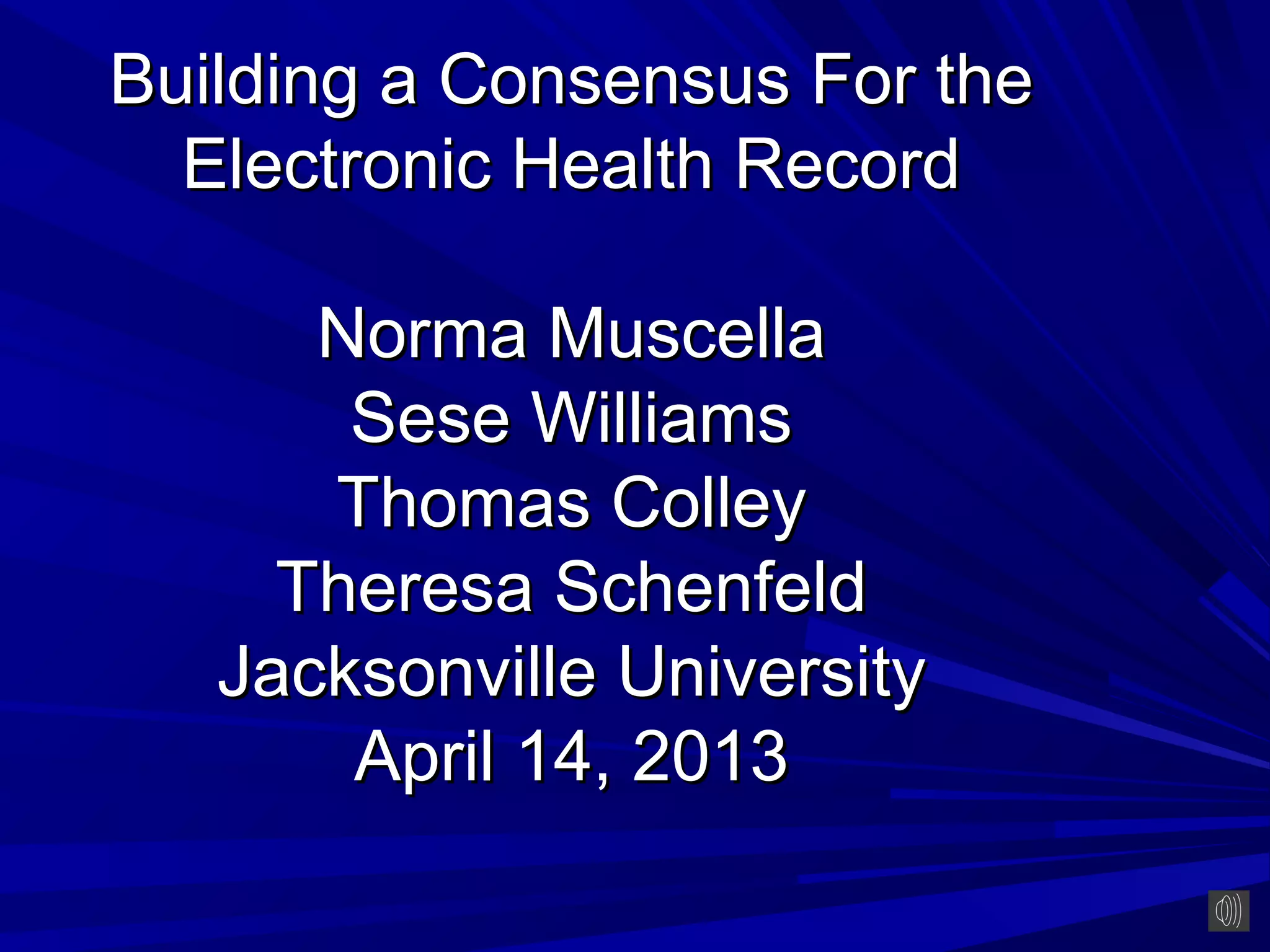 This document discusses building consensus for electronic health records (EHRs). It begins by defining EHRs and distinguishing them from electronic medical records (EMRs). The document outlines the benefits of EHRs, such as reducing medical errors, improving patient outcomes, and empowering patients. It also discusses meaningful use standards and key aspects of EHR implementation like computerized physician order entry. Overall, the document emphasizes that successful EHR adoption requires thorough preparation, customized training, and comprehensive security planning.