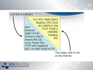 The document outlines the essential steps for building a SCADA Cyber Security Operations Center (SOC), emphasizing the integration of people, processes, and technology to enhance cybersecurity posture and incident response. Key objectives include managing cyber threats, monitoring incidents, ensuring compliance with regulations, and developing effective communication and reporting structures. The SOC framework is designed to proactively monitor security infrastructures, automate incident response, and incorporate risk management aligned with business needs.