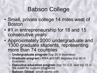 The document outlines Babson College's approach to developing a digital marketing strategy, addressing previous challenges such as a poorly organized website and a lack of institutional strategy. It emphasizes the importance of internal and external relationship building, governance, and prioritizing content strategies to align with institutional goals. Key lessons include the necessity of hiring the right team quickly, continuous check-ins with stakeholders, and focusing on education and training in digital marketing efforts.