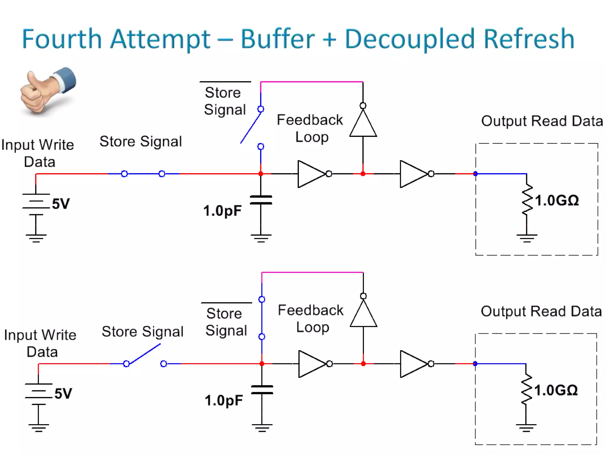 The document discusses various attempts at developing memory elements, highlighting the time constants associated with different designs. It specifically mentions the creation of a D latch and a negative edge-triggered D flip-flop, addressing issues related to undefined states. Overall, it outlines the evolution of these memory components and their increasing complexity.