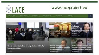 The document outlines the efforts to build a European learning analytics community through the Learning Analytics Community Exchange (LACE) project, highlighting various strategies for outreach, engagement, and sustainability. It details ongoing collaborations among several universities across Europe and emphasizes the importance of building a supportive international network. The project, supported by the European Commission, was presented at a conference in 2018, showcasing current learning analytics projects funded by Europe.